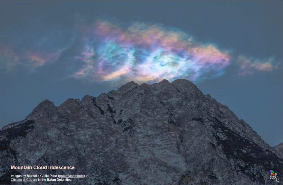 Orographic Cloud iridescence, Dolomites, Italy - OPOD. Atmospheric Optics. Retrieved from https://www.atoptics.co.uk/blog/orographic-cloud-iridescence-dolomites-italy-opod/.